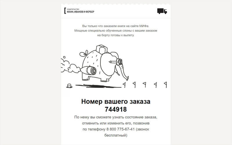 - Издательство «Манн, Иванов и Фербер» шлёт письма с летающими слонами, даёт возможность узнать о состоянии заказа, а в день заказа звонит и пишет СМС. А ещё у них мощное коммьюнити, отличные книжки и продуманный маркетинг, частью которого являются те самые слоны.